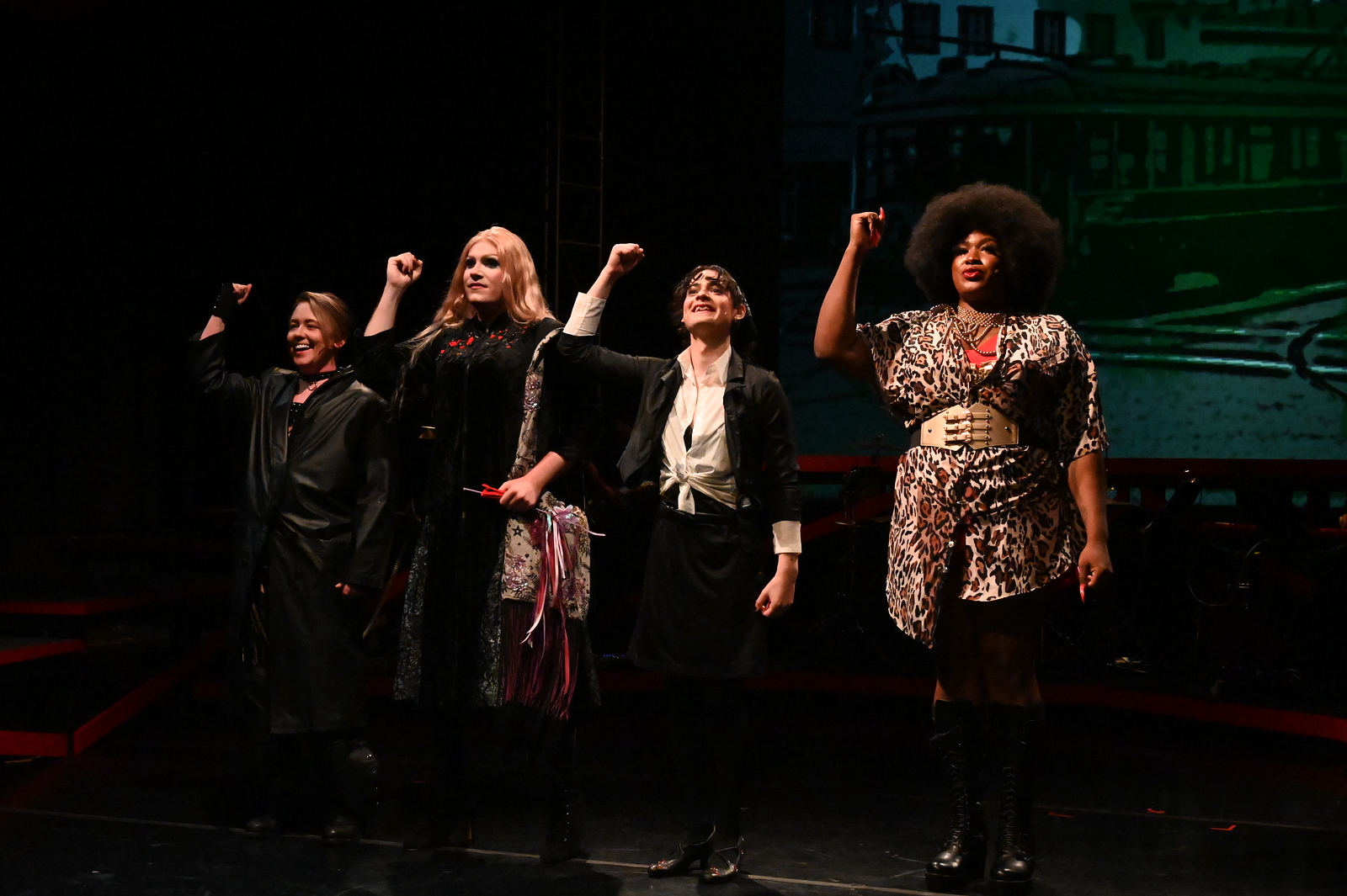 Adam KuveNiemann gets to flex a host of scumbag sensibilities (and a terrific voice) as the abusive father, the sadistic doctor, and the sheriff. Ida finally escapes and arrives in San Francisco, finding a room with three of the wildest trans superheroes one can imagine (“Welcome to Flip House”). Chris Steele (Genevieve), Ezra Reeves (Tommy) and B Noel Thomas (Sherry) embody these three with amazing style and powerful vocals.