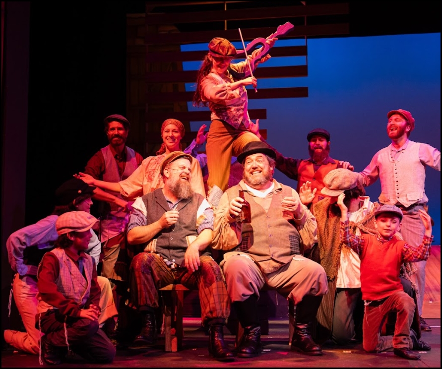 While PAP’s Fiddler is charming in so many ways, this reviewer found one character, Fiddler Eliya played by Chava Roy, a tiny bit tiresome as she repeatedly climbs up the stairway to a small balcony and then pretends to play on her “fiddle.”