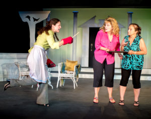 The set is ingeniously used for swapping scenes between Bubbie’s house, the bookstore and side scenes of engagement, with choreography that keeps the action fluid and cogent. Costuming changes are continuous and keep the visual action lively with each character defined by clothes, especially Isabelle, who wears the same rather dowdy outfit into Act 2 and verges on tempting us to run up and rip it off her.