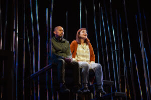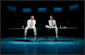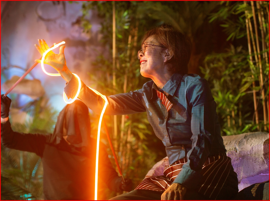 Understanding who is real and who is a robot or ‘simulation’ challenges us as the story and timeline proceed, and actors take on multiple roles. A standout is Will Dao, playing four very different personas, all to amazing effect. He grabs our attention immediately with every unexpected appearance. This is truly an eye-popping show, replete with suggestive dancers, sinuous and menacing cyber light cords, and alternate states of consciousness or digital manipulation depending on which of the corporate robots or managers are controlling the scene.