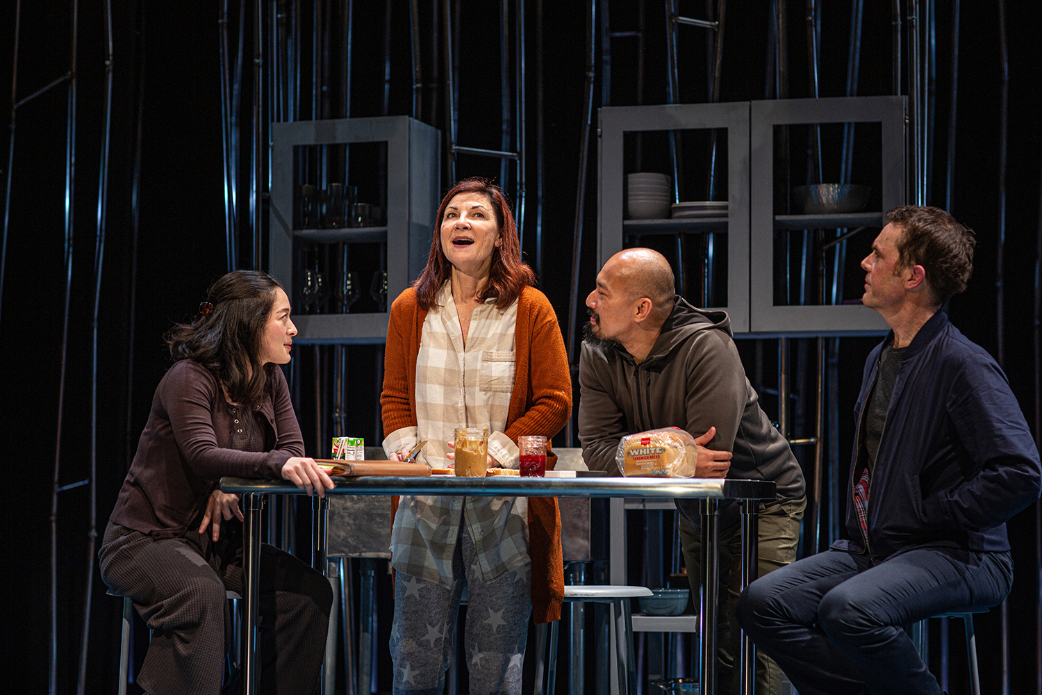 Whether a rotating stage is appropriate for this production is a matter of personal opinion. Lo also has his actors sit stage-left and stage-right when they are not in a scene, like basketball players on the sidelines waiting to return to the game.
