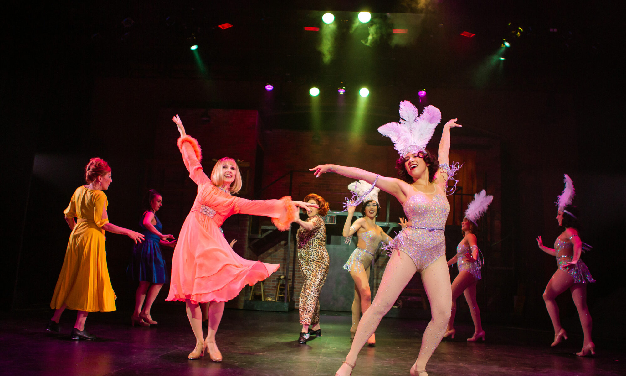 Adelaide (Melissa WolfKlain, center) performs with the Hot Box Girls (from left, Malia Abayon, Alison Ewing, Jill Slyter, and Brigitte Losey) in “Guys and Dolls.”