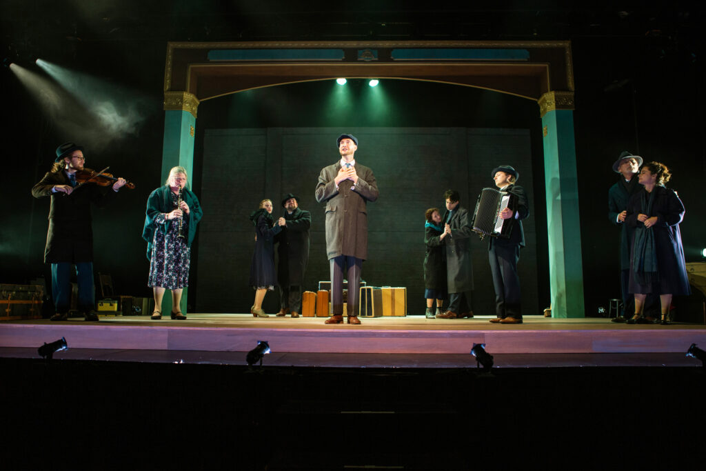 Lithe and intense Maggie Mason shows us the women in Hannay’s life: Annabella, the spy whom Hannay is accused of murdering; Pamela, the girl on the train whom he first meets by attacking her with kisses; and Margaret, the collier’s wife who helps him escape from murderous thugs. Greg Ayers showcases a multitude of male and female roles with comic physical and facial wit that continually inspires laughter, as do his double takes for additional laughs. He both opens and closes the show with an important character, Mister Memory, and his shenanigans expand this role with his stage antics.
