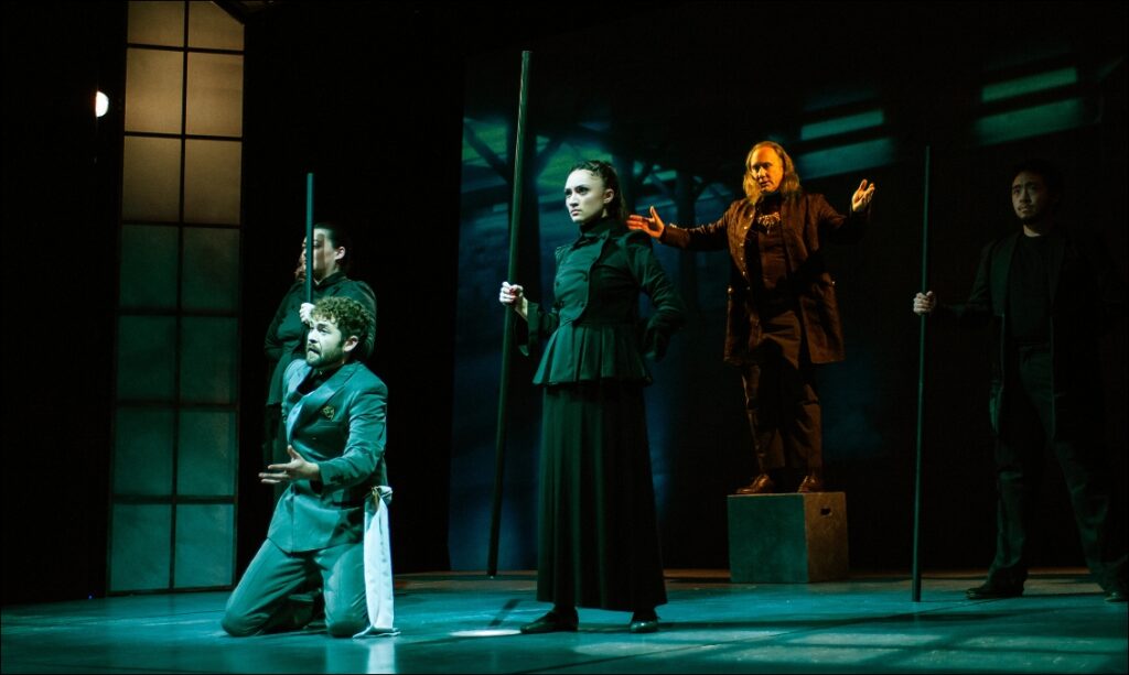The challenge and ultimate success of scene changes and manipulations are handsomely done by the creative team under the direction of Mei Ann Teo. Projections are used to great effect in many scenes and in many parts of the stage by Hao Bai, and the scene swivels to reveal three different sets, times/places and states of consciousness.