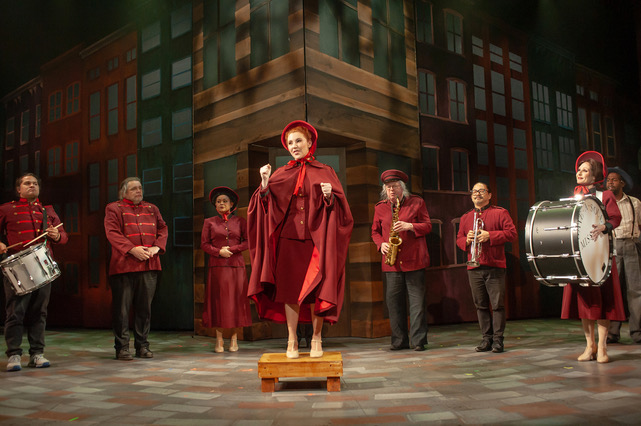 Frank Loesser’s music (and lyrics) for this rendition — accompanied by a sprightly, hidden-onstage band under the direction of Dave Dobrusky — reaches the epitome of peppy, ideal for the holiday season.