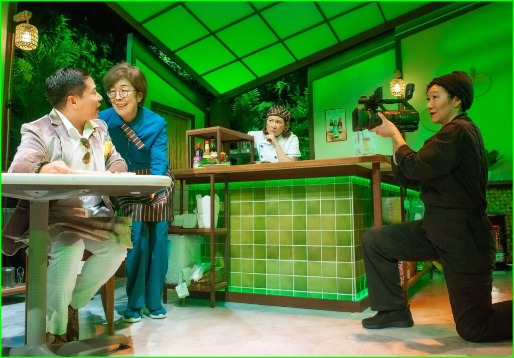 Next, they are greeted by marketeer Vera, who represents Novus Corporation, the company taking over local real estate. She promises the shop will be transformed, dripping with cachét and busy with customers now that Lan has won the grant. And Vera, smartly and charmingly played by Rinabeth Apostal, can make it all happen: the blank white shop turns to orange ambience, NFTs (Non-fungible tokens in cyber-talk) grace the walls, and the backyard becomes a Vietnamese jungle.