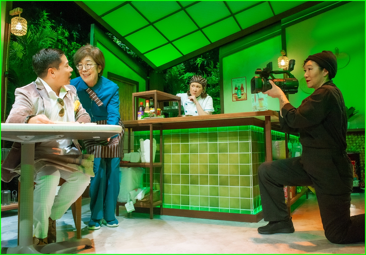 (L-R) A food critic (Will Dao) samples cuisine, watched by Lan (Sharon Omi), Mai (Jenny Nguyen Nelson) and a camera person (Erin Mei-Ling Stuart) in SF Playhouse’s “My Home on the Moon.” Photo Credit: Jessica Palopoli
