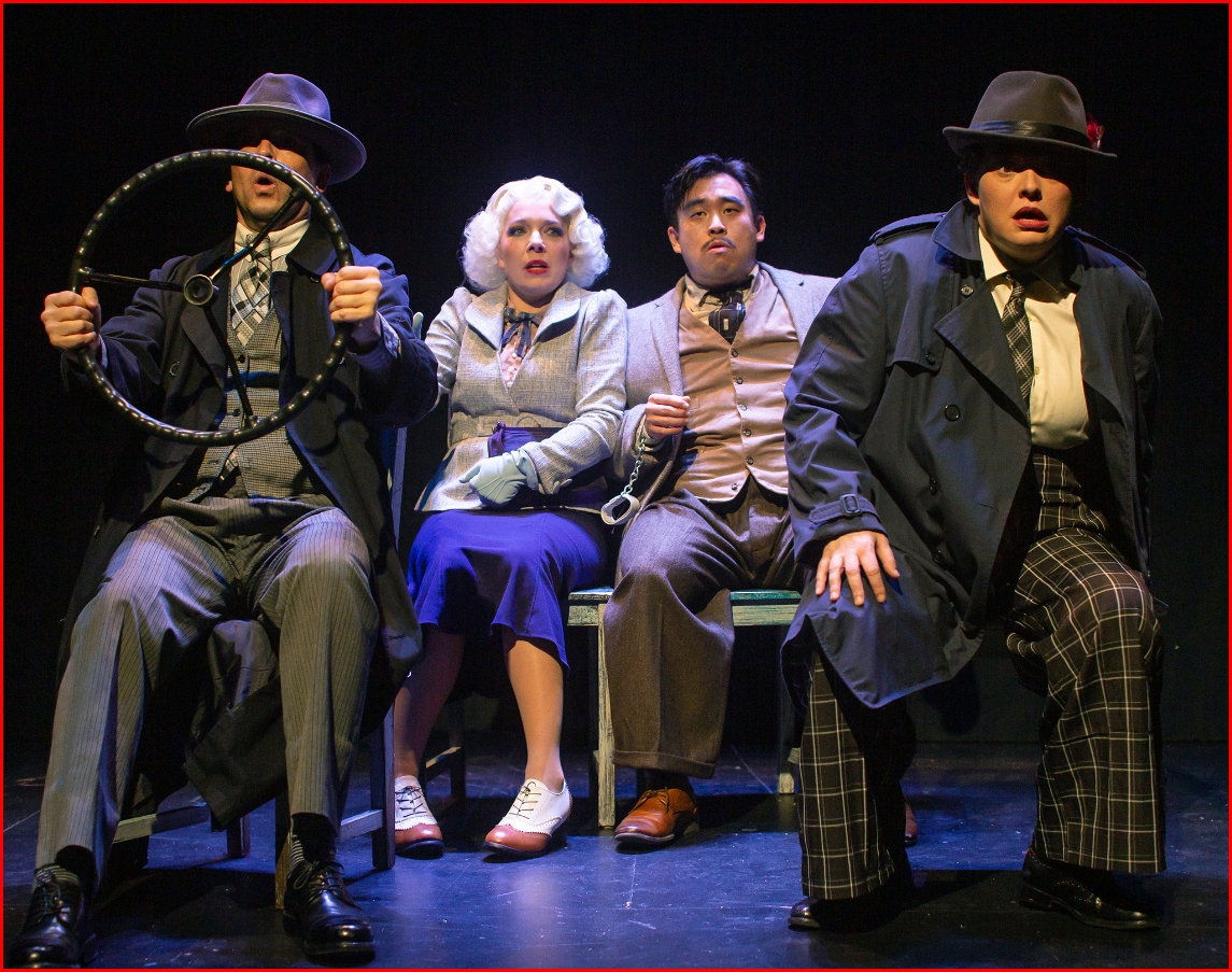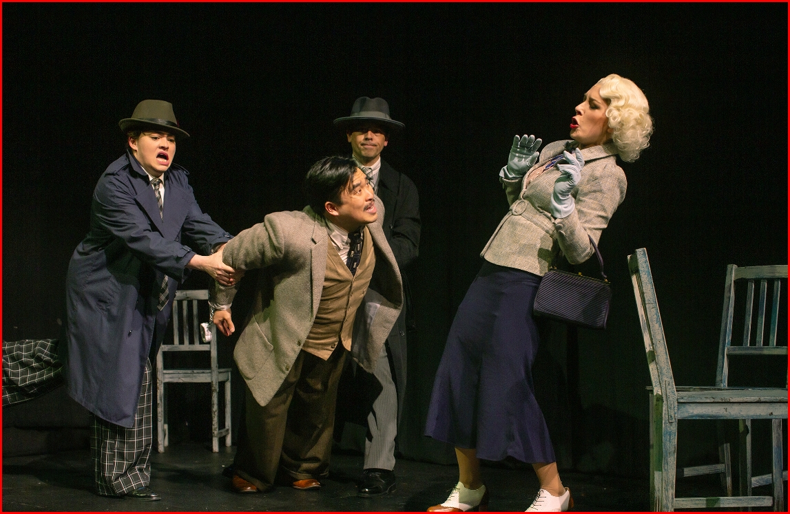 Richard Hannay (center - Phil Wong) is apprehended by two policemen (l to r: Renee Rogoff and Greg Ayers) as Pamela (Maggie Mason) denies association in “The 39 Steps,” presented by SF Playhouse. Photo Credit: Jessica Palopoli