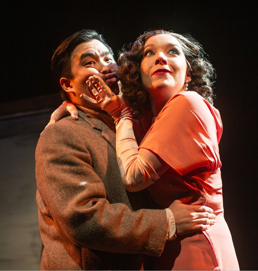 Richard Hannay (Phil Wong) is captivated by the mysterious Anabella (Maggie Mason) in “The 39 Steps,” presented by San Francisco Playhouse March 7 - April 20. Photo Credit: Jessica Palopoli