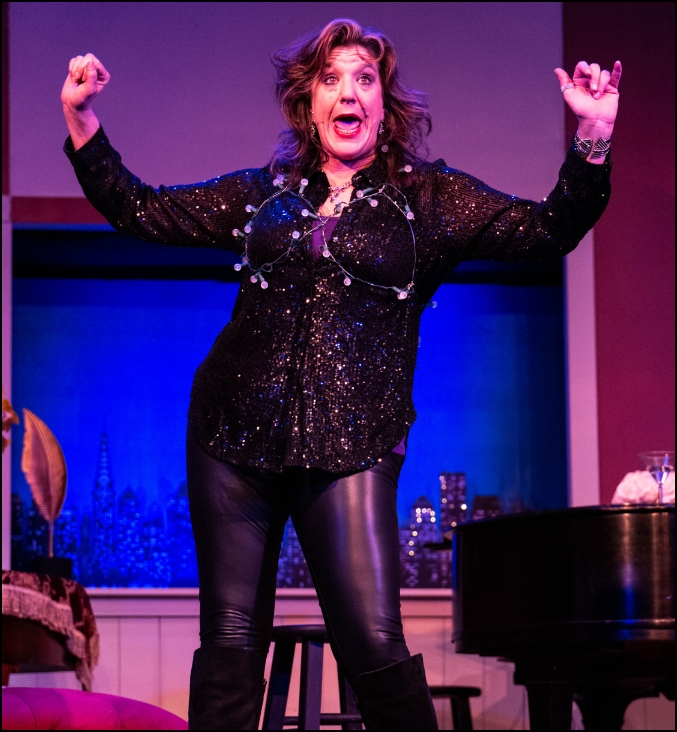 The adult woman and the runaway form an almost-instant bond, reinforced early in the first act by the joyfully infectious song “Chums,” one that sets the emotional tone for the entire production. Innocenti-Beem is amazing as mentor/fairy godmother to a goofy talented girl with single-minded devotion toward becoming the next Ethel, as is 17-year-old Sutherland in conveying the innocence, enthusiasm, and vulnerability of adolescence. Playing younger is difficult for all performers, and Sutherland does it perfectly. As the story progresses, Muriel meets legendary musical theater impresario David Merrick (Patrick Barr), enjoys performances at the St. James Theatre, and dinners-and-drinkfests at Sardi’s. She also becomes Merman’s permanent house guest. Stars in her eyes, indeed.